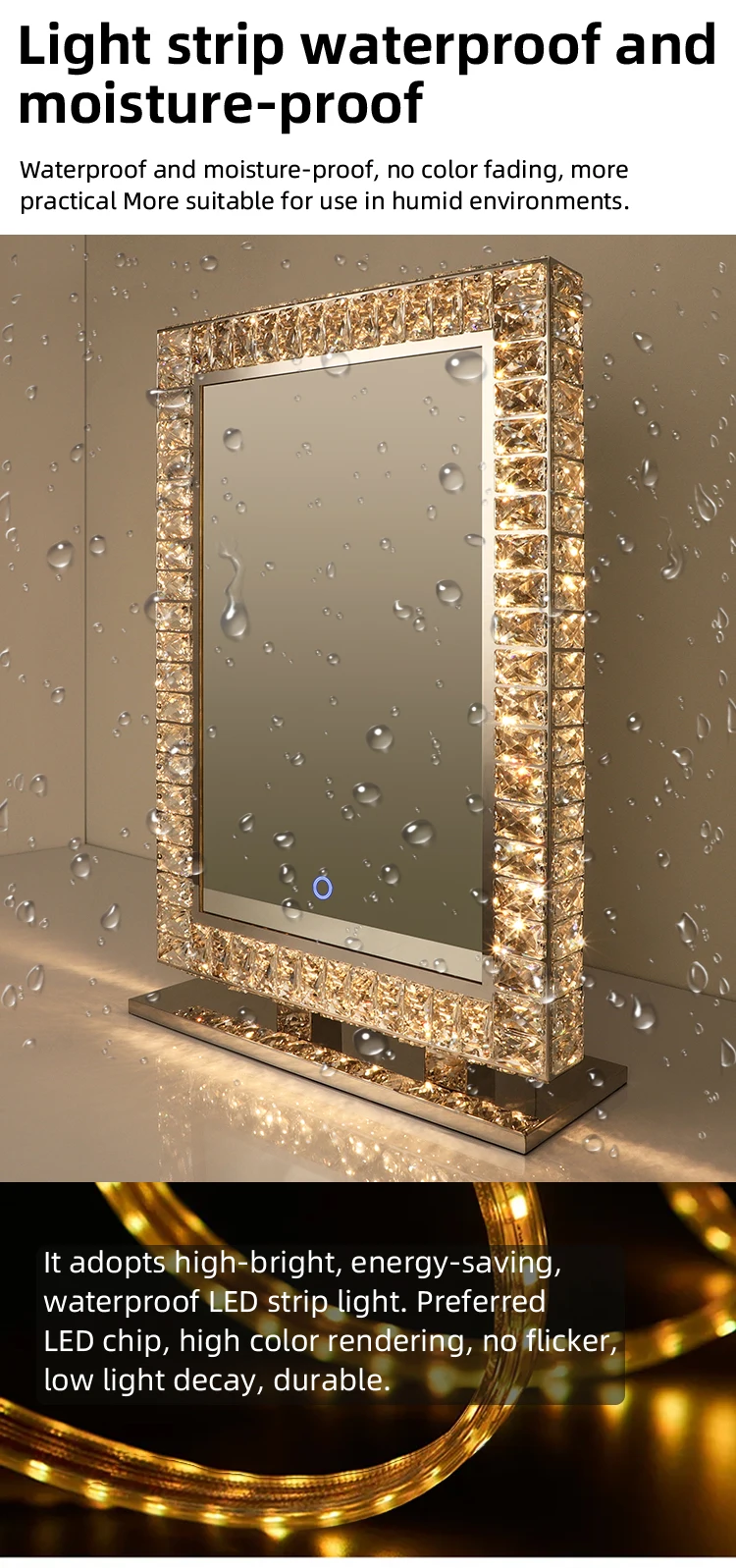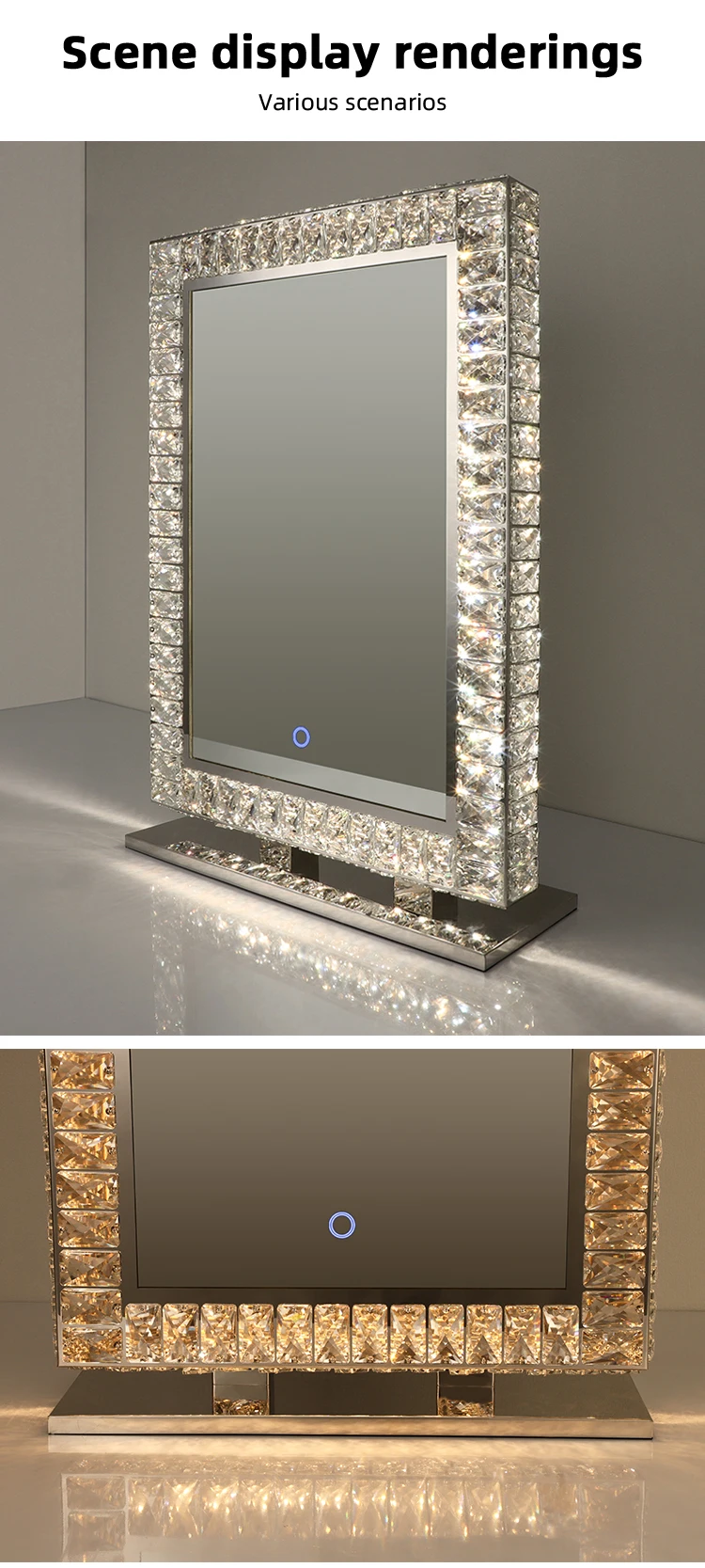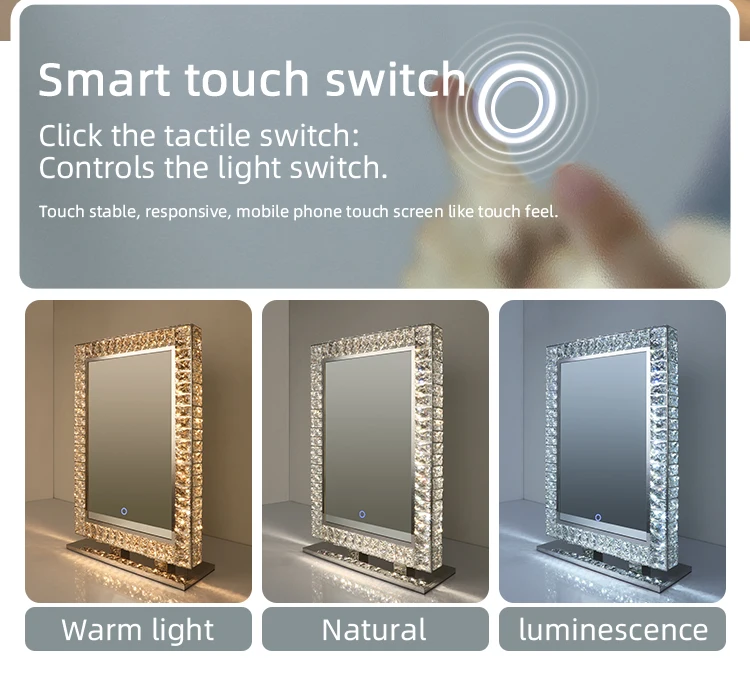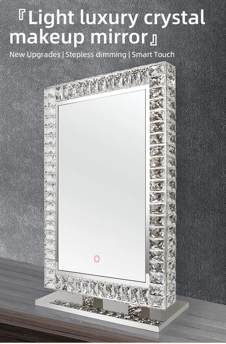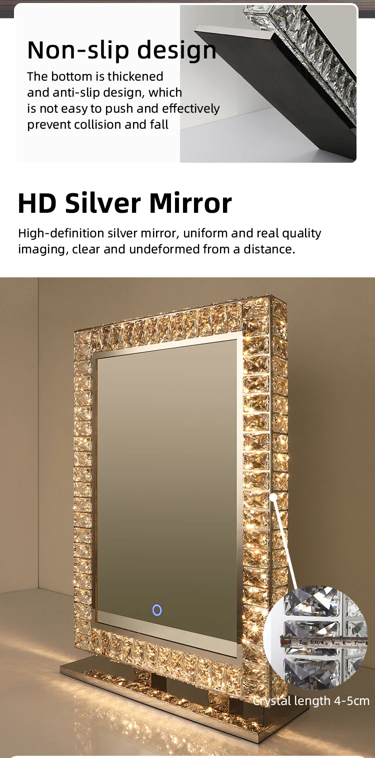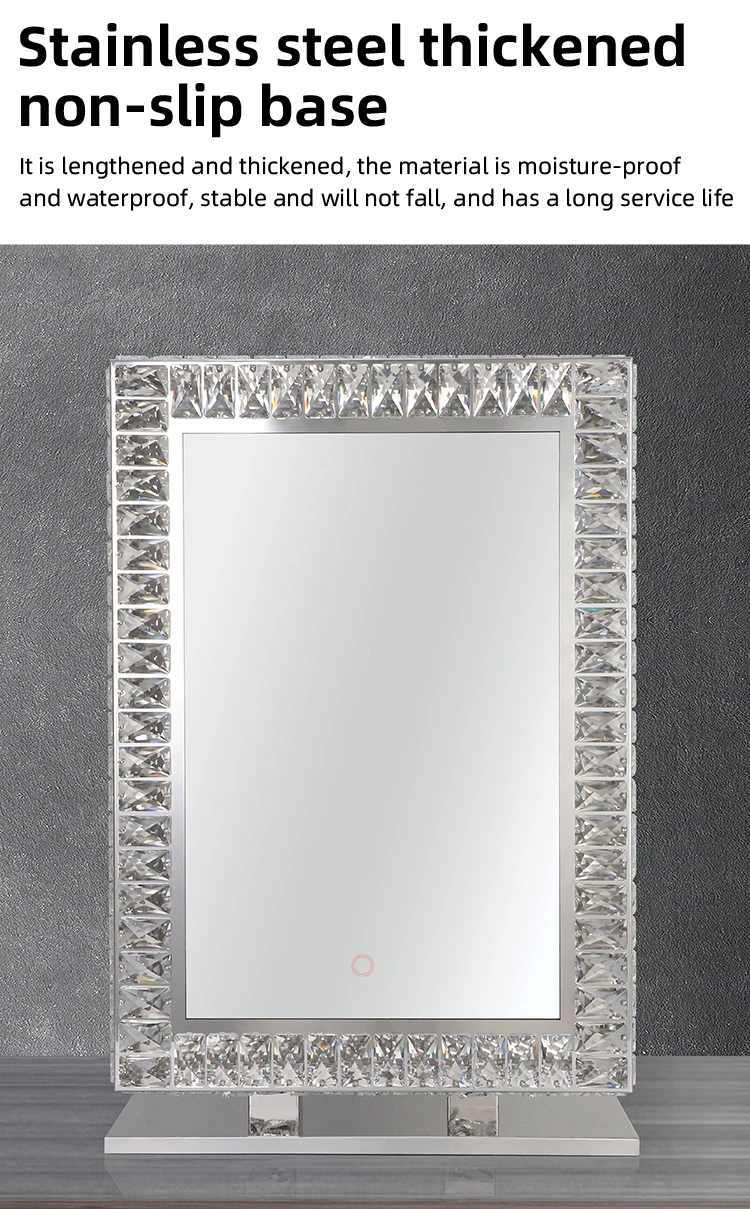 Hotel Custom Modern Rectangle Free Standing Bathroom Smart Make Up Hair Salon Crystal Mirror With Led Lights And Shelf